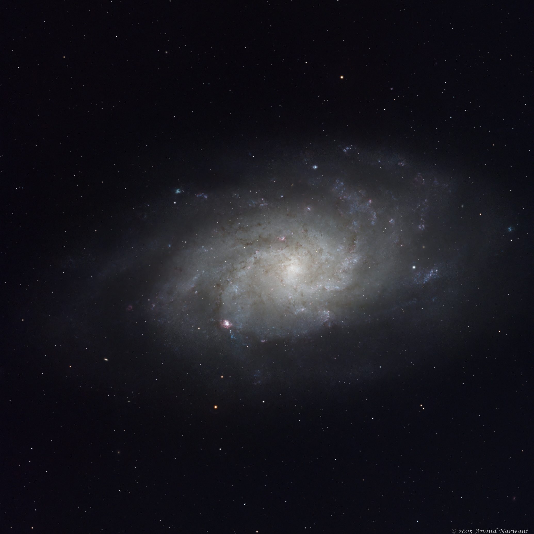 A spiral galaxy located in the constellation Triangulum (shaped like a Triangle no less!). M33 is smallest of the three galaxies in our local group: The Andromeda Galaxy (M31) and our own milky way are the other two. The Blue colored regions show regions of rapid star birth and if you look closely you'll see a number of bright nebula within the arms of the galaxy.